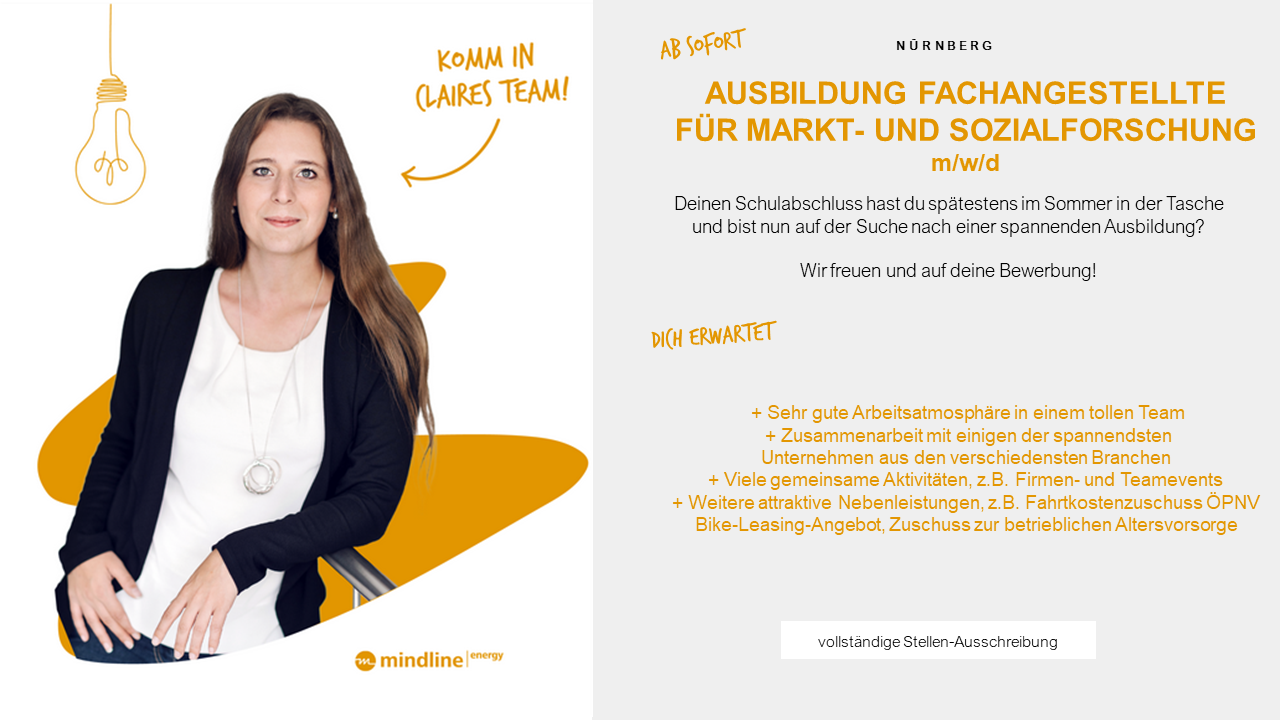 Seit 2017 bildet mindline energy junge Menschen zu Fachangestellten für Markt- und Sozialforschung aus. Dabei ist uns neben der Vermittlung von Fachwissen auch die persönliche Entwicklung unserer Auszubildenden sehr wichtig. Die Azubis bekommen Einblick in den gesamten Projektablauf und übernehmen im späteren Verlauf auch selbst die Planung von Studien und Forschungsprojekten. Sie sind damit fester Teil des Teams von mindline energy und mittlerweile schon nicht mehr wegzudenken.