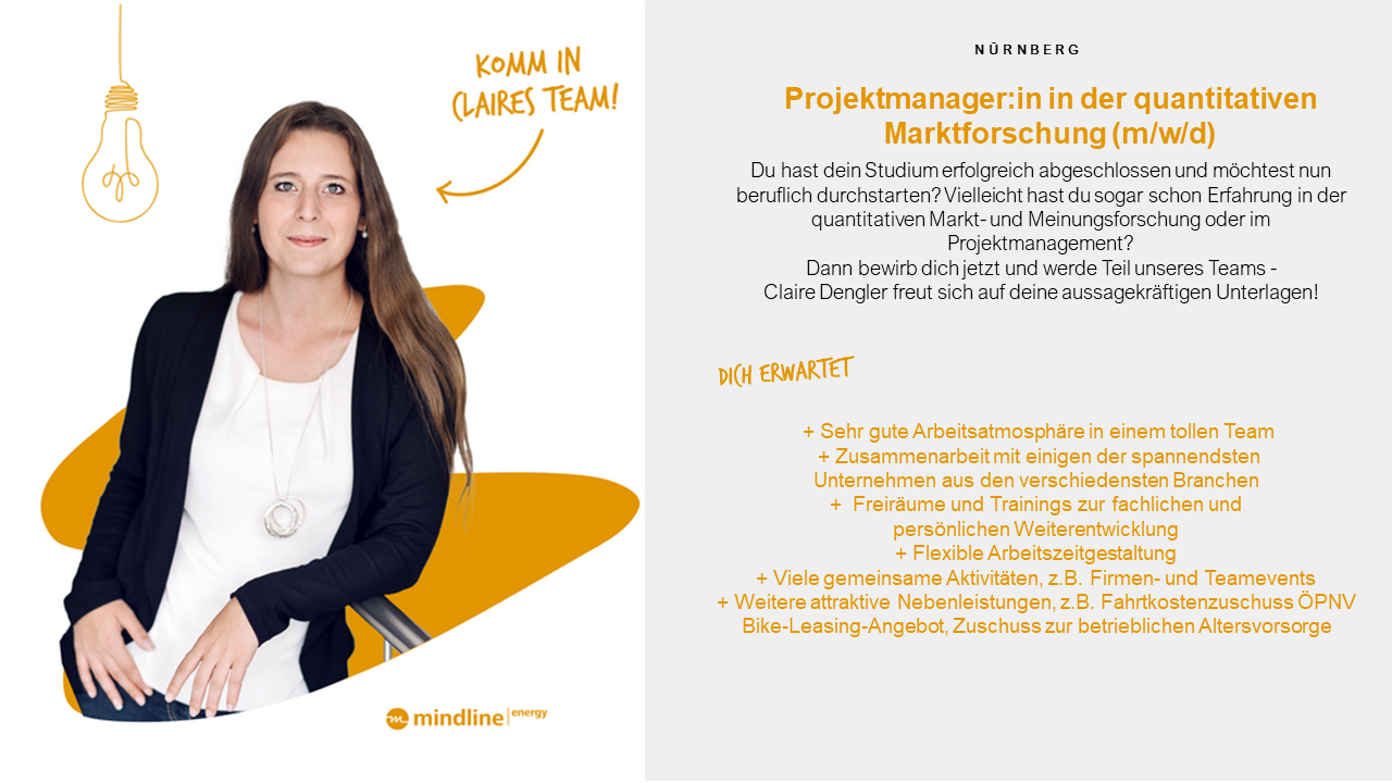 Projektleiterin bei mindline energy seit 2016 | Research-Erfahrung seit 2014 (ForschungsWerk, ForschungsWeb) | Schwerpunkt: Werbe- und Kommunikationsforschung | Branchen-Expertise: Energie- und Versorgungswirtschaft