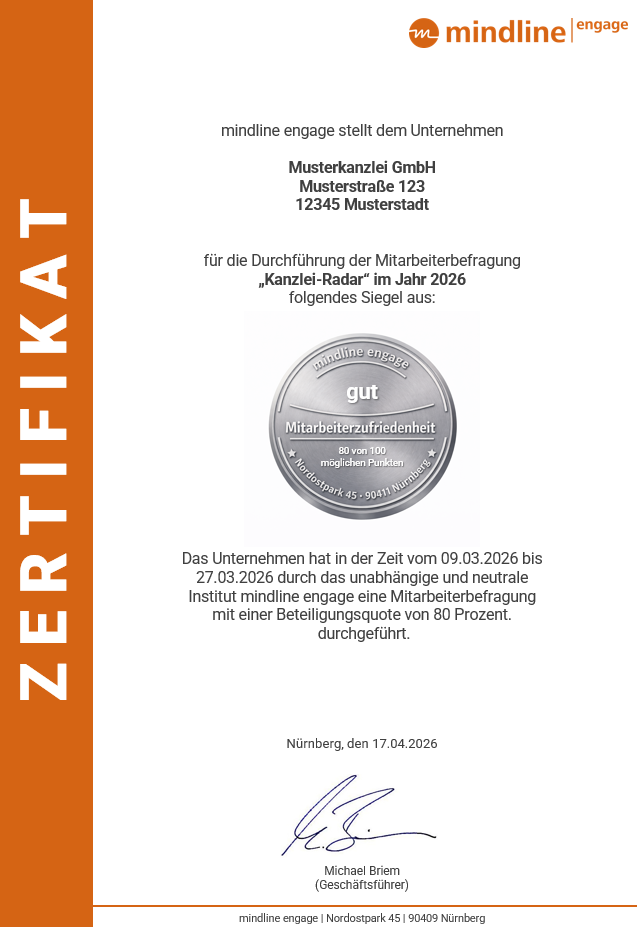 Das Kanzlei-Radar von mindline engage unterstützt Kanzleien dabei, im Wettbewerb um Fachkräfte gezielt die Arbeitgeberattraktivität zu stärken und Verbesserungspotenziale frühzeitig zu erkennen. Die im Kanzleimarkt erprobte Mitarbeiterbefragung liefert klare, priorisierte Handlungsempfehlungen, differenzierte Auswertungen auf Kanzlei- und Teamebene sowie aussagekräftige Benchmarks im Marktvergleich. Als neutrales Institut sorgen wir für hohe Akzeptanz und garantieren Vertraulichkeit und Anonymität bei gleichzeitig effizienter und kostenschonender Durchführung.